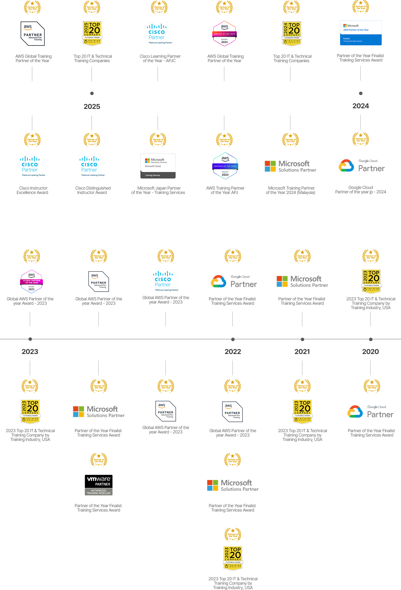 글로벌 벤더의 공인 교육을 진행하면서 쌓아온 실력과 신뢰는 수년간에 걸친 수상내역에서 확인할 수 있습니다. 저희는 오랜 기간 동안 다양한 글로벌 벤더와 협력하며 공인 교육 프로그램을 제공해왔으며, 이를 통해 축적된 전문성과 신뢰는 수많은 수상 경력을 통해 입증되었습니다.